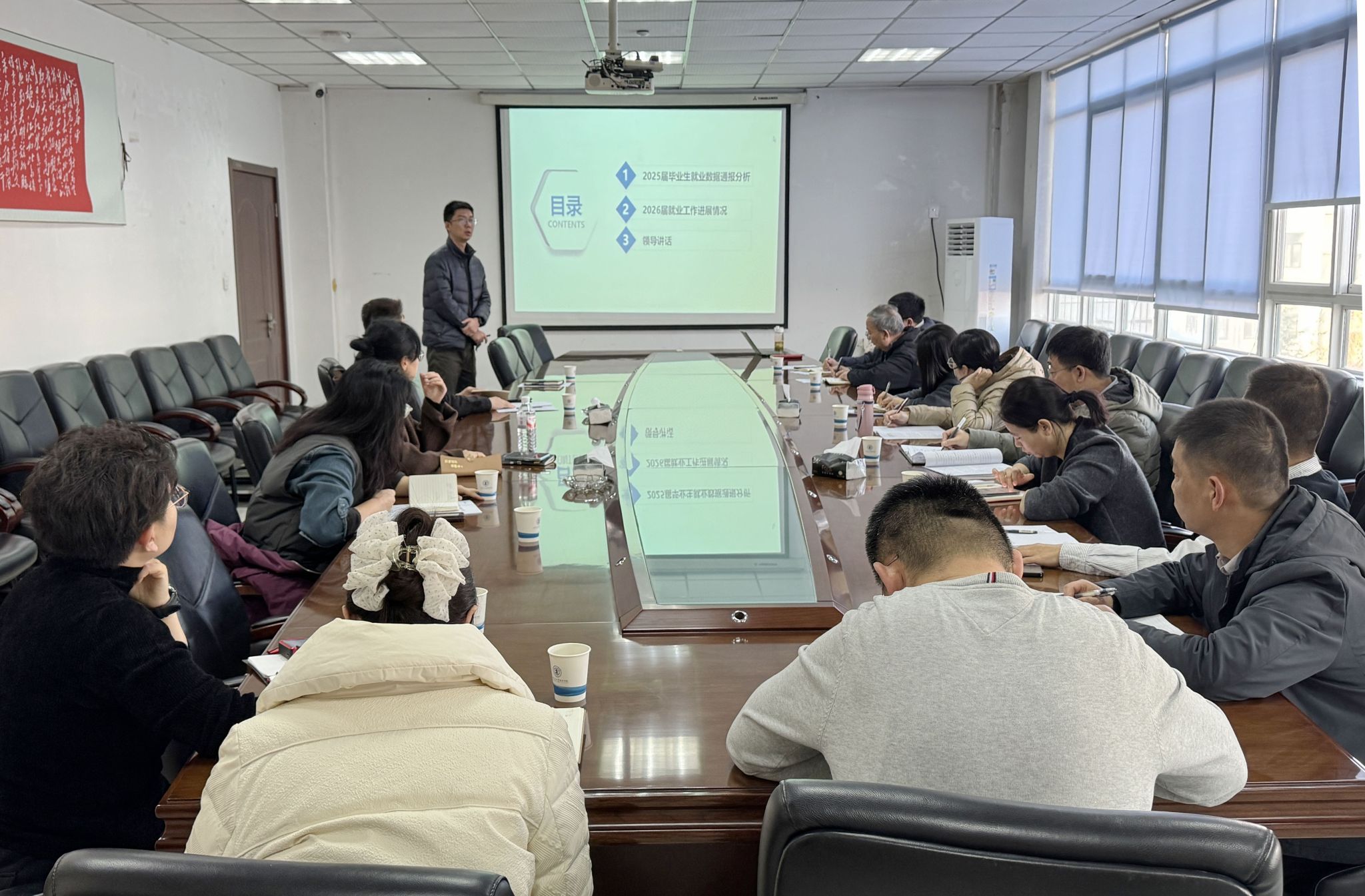 招生就业处副处长吴昊翔对2025届、2026届毕业生就业情况进行通报。他结合当前工作的推进情况对2025届毕业生就业工作评价及2026届毕业生就业情况监测、访企拓岗、就业工作激励政策等相关情况作详细说明。