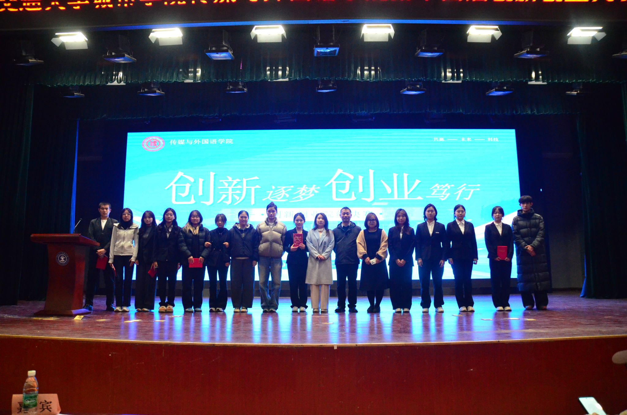 传媒与外国语学院于12月11日19:00在教二报告厅成功举办第十四届大学生创新创业大赛院级决赛。传媒与外国语学院院长助理刘敏涛,专项工作负责人杨月、指导教师代表焦铭、辅导员任瑾、李久榕及2024级、2025级全体学生参加本次活动。