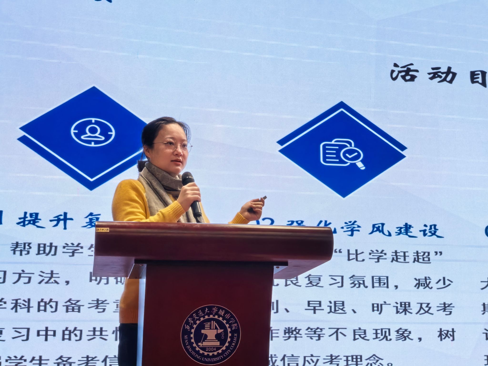 在前沿技术报告结束后,学风建设主题活动正式启动。电气信息学院院长助理廉宇婷进行学风建设政策宣读与动员讲话。她解读了学校及学院关于加强学风建设的相关政策要求,明确了学风建设的核心目标与具体举措。她结合电气专业学习的特点,从课堂纪律、课后复习、科研实践、诚信考试等多个维度,对同学们提出了具体的学习要求与期望。她鼓励同学们树立正确的学习态度,主动搭建互助学习小组,形成比学赶超的良好学习风气,以扎实的专业知识筑牢成长根基。