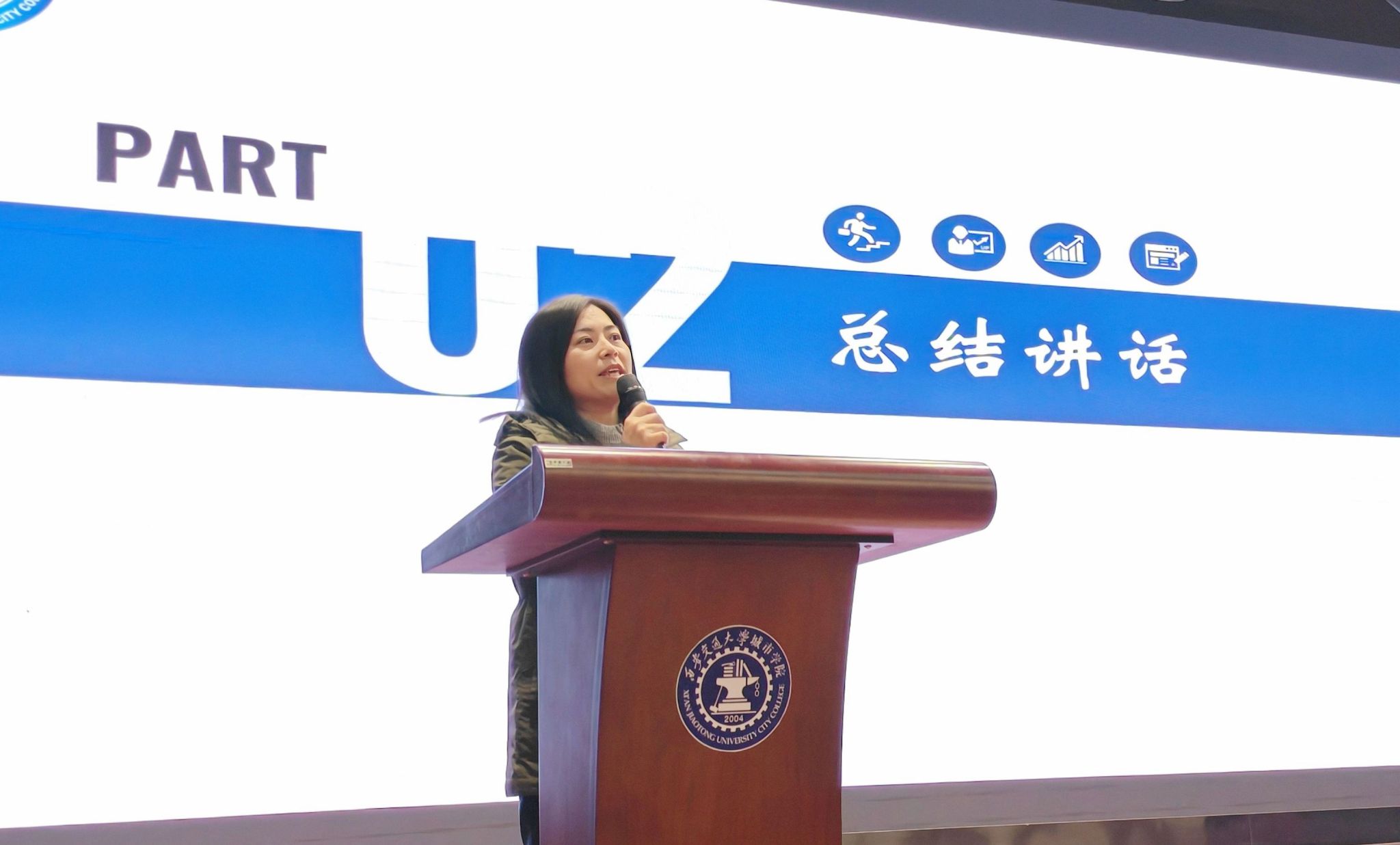 电气信息学院副院长刘晓明对本次活动进行总结。她对阎治安的精彩报告表示衷心感谢,肯定了本次前沿技术报告在拓宽学生视野、助力专业认知方面的重要作用。随后,她强调了学风建设对于人才培养的基础性、关键性意义,要求全院师生协同发力,将学风建设工作落到实处。她希望同学们以此次活动为契机,既要胸怀科技报国之志,关注行业前沿动态,也要脚踏实地锤炼专业本领,以优良学风赋能成长成才,努力成为符合行业需求、适应时代发展的电气领域优秀人才。