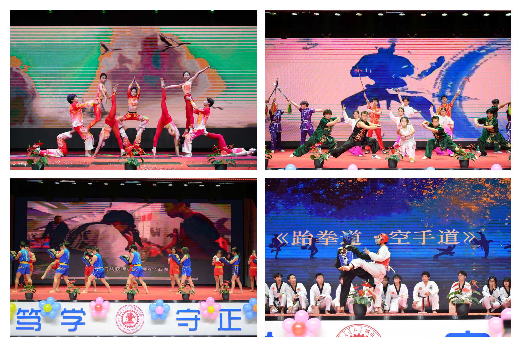 热烈氛围中,瑜伽表演带来别样的静谧体验。表演者在光影流转中舒展肢体,柔美与力量并重。武道展演则进一步将晚会推向高潮,太极拳表演行云流水,一招一式刚柔并济。武术表演刀枪交锋间寒光迸射,双截棍洒脱旋转,尽显中华武魂的磅礴气势;跆拳道旋风踢势如破竹,空手道手刀精准劈击,散打招式刚劲迅猛,极致的视觉冲击让全场掌声雷动。台上学子尽情挥洒,台下欢呼此起彼伏,光影与笑容交织,成为冬日校园里最温暖耀眼的风景线。