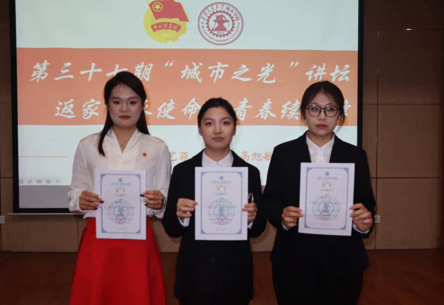 第三十七期“城市之光”讲坛于3月19日举办。本次讲坛以“返家乡承使命,青春续雷锋”为主题,邀请王妍、高旭敏、孙艺菲三位同学担任主讲,分享返家乡志愿服务实践经验,引导青年学子传承雷锋精神、投身基层服务。
