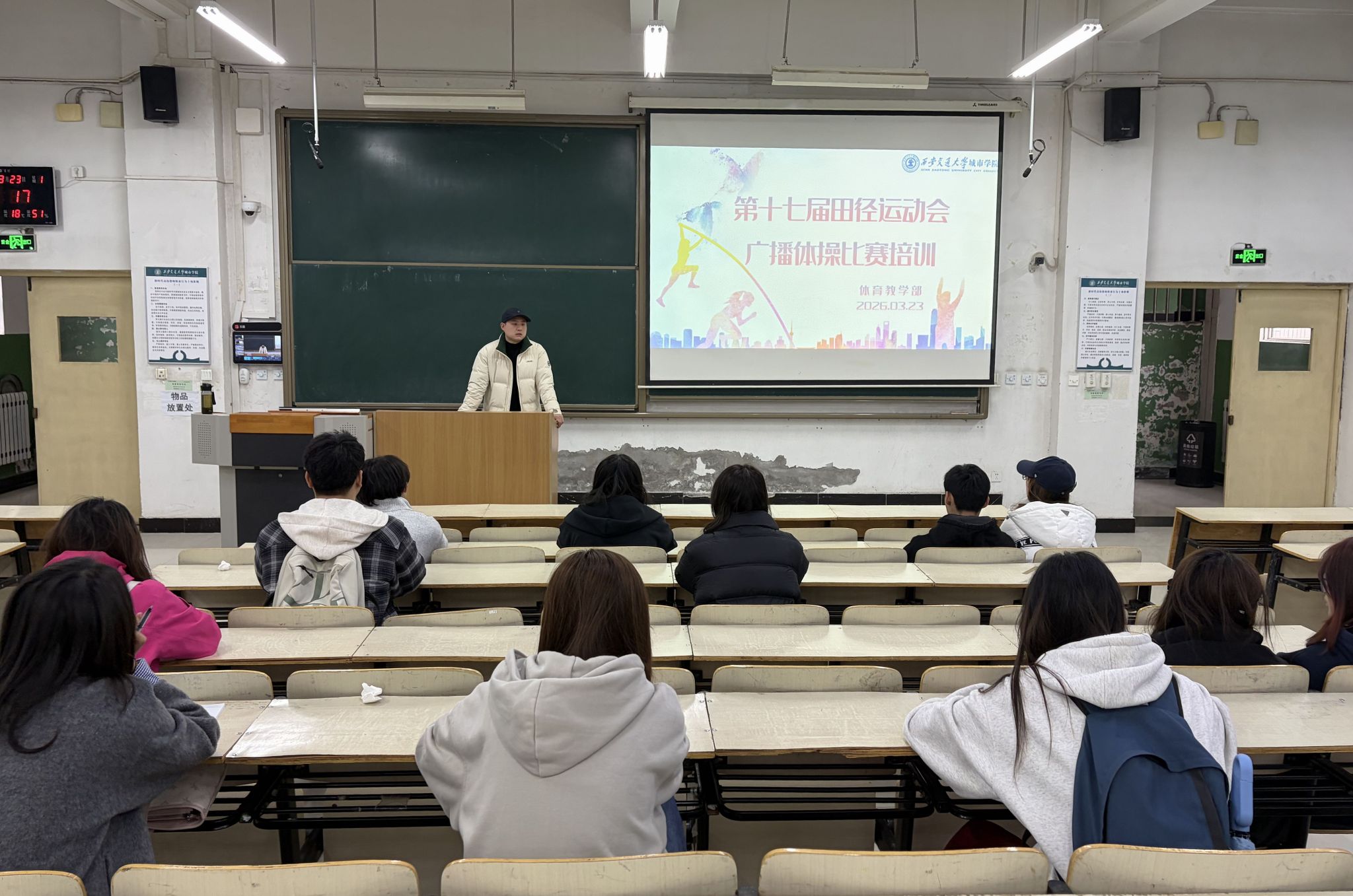 3月23日中午,第十七届田径运动会广播体操比赛培训会在教学楼B100举行。各二级学院学生负责人及领操员共同学习比赛规范与动作要领,通识教育学院体育教学部主任助理周帅主持本次培训会。