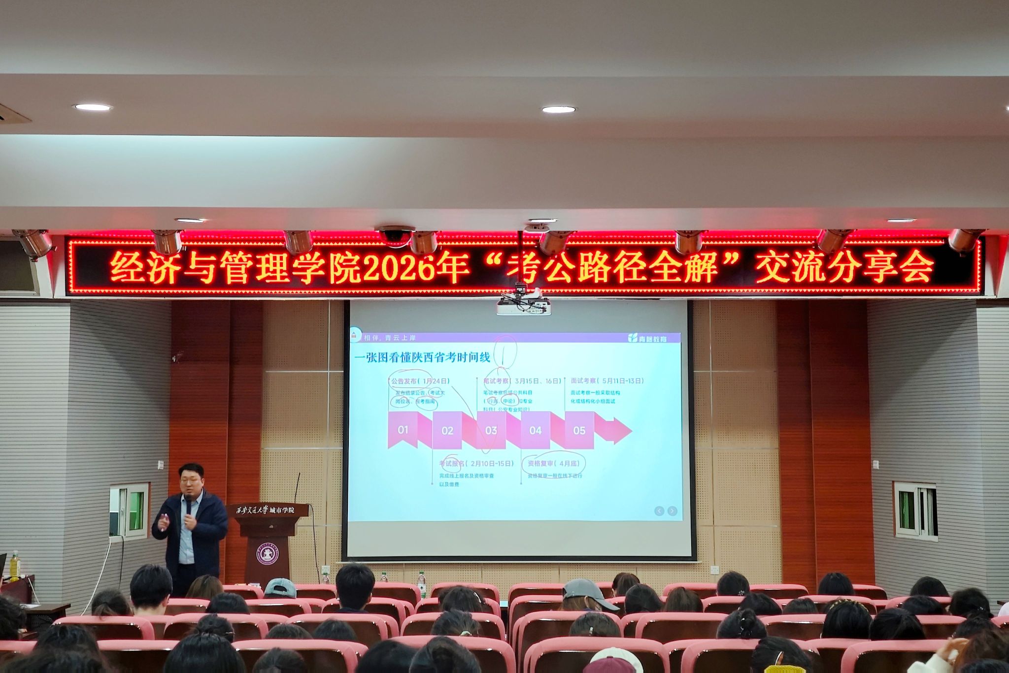 为帮助学生明晰公务员、事业单位招录考试考情,科学规划备考路径,提升公考应试能力与就业竞争力,4月8日晚,经济与管理学院举办2026年“考公路径全解”交流分享会。本次分享会特邀青藤教育总经理、教研院院长刘振国主讲,院长助理刘健、团工委书记柯智航及学院有公考意向的学生到场参与学习交流。