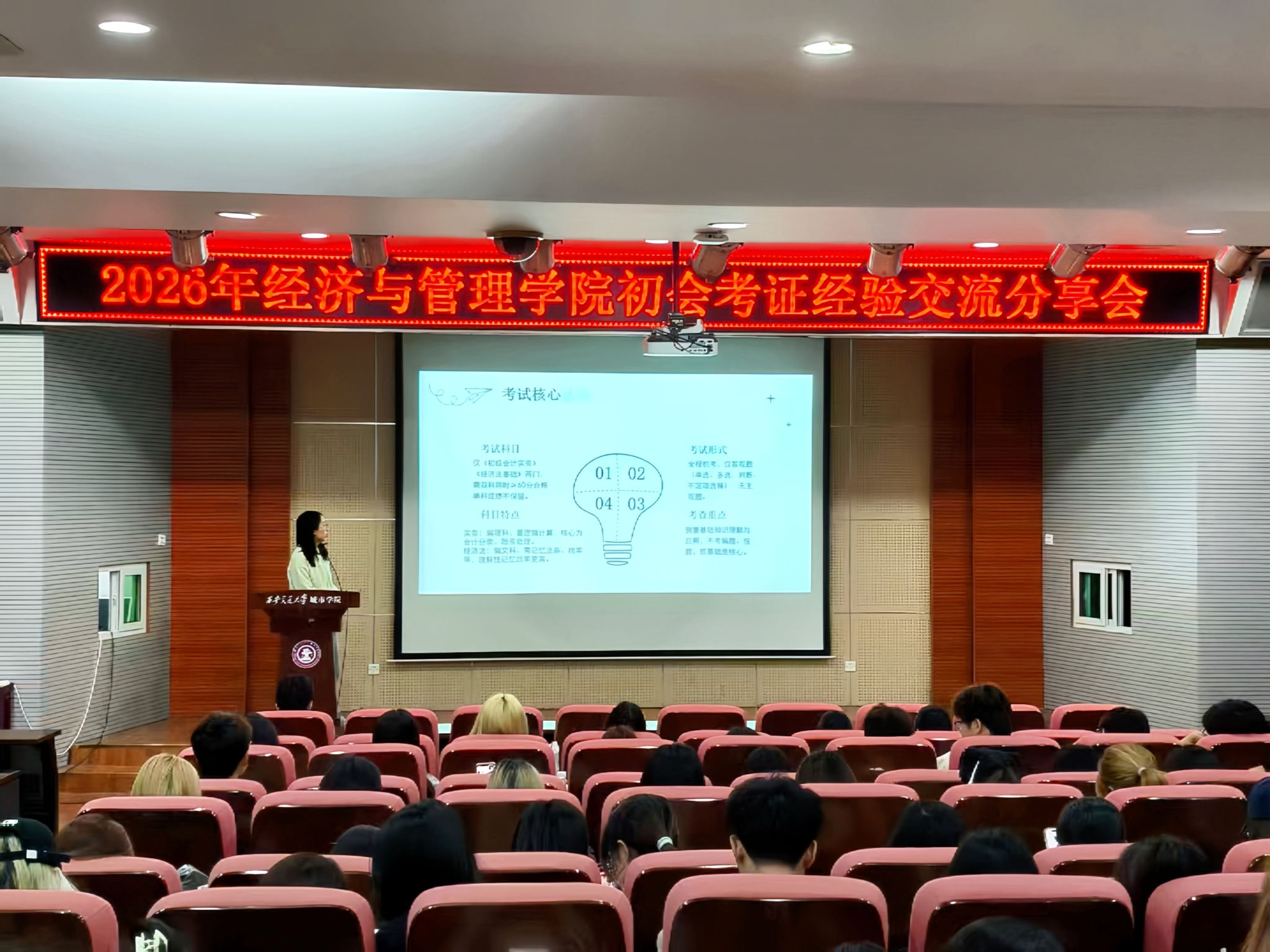 为切实解决同学们对初级会计专业技术资格证备考困惑,明晰考证学习方向,助力大一新生夯实学业基础、提升就业竞争力,4月13日晚,经济与管理学院举办2026年初级会计专业技术资格证考试经验交流会。