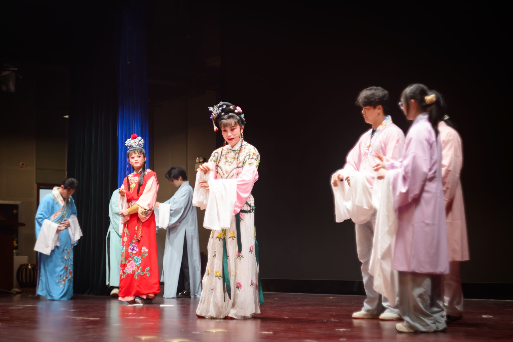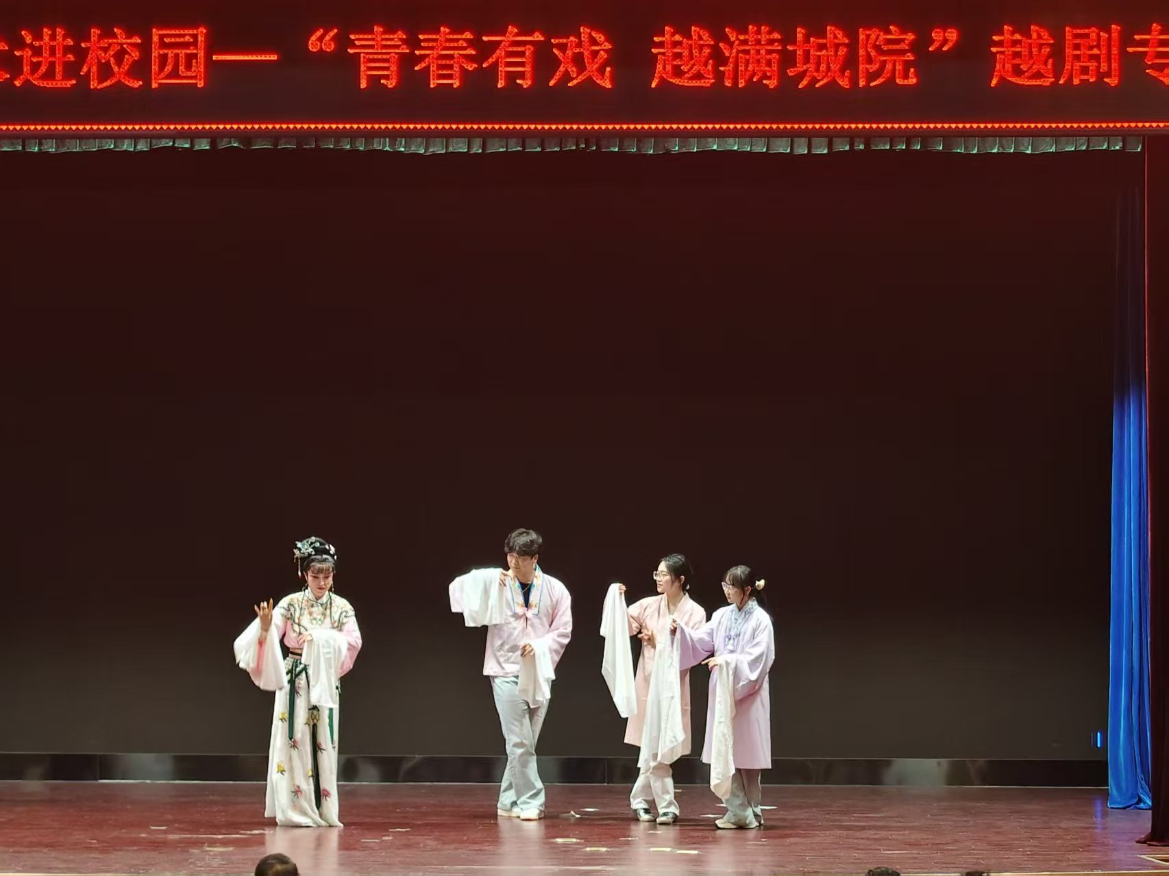 互动环节过后,经典好戏接续上演。《红楼梦・读西厢》《双烈记・夸夫》《情探・活捉》等经典折子戏轮番献演,名家新秀同台绽放,婉转越音萦绕报告厅全场。演员们扮相清雅、唱腔悠扬,以精湛的舞台功底,把传统越剧的古韵风骨与故事情思娓娓道来,为在场师生献上了完整饱满的戏曲盛宴。