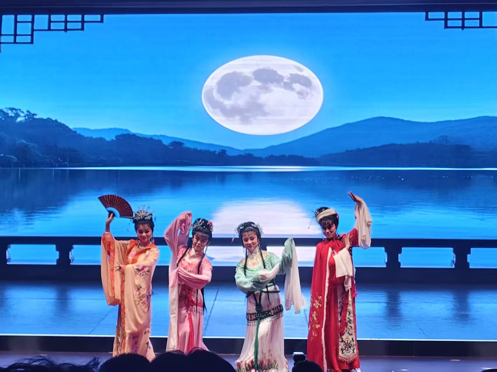 西安青年越剧团的演员们依次登台,雅致婉约的国风氛围便萦绕全场。演员们身着精致戏服,凭借扎实的表演功底,演出曲目涵盖经典越剧选段、流派唱腔组合、传统折子戏等多元内容,《红楼梦》《梁山伯与祝英台》《西厢记》等家喻户晓的经典名篇轮番上演。开篇《四美咏月》婉转起韵,再从黛玉葬花的凄美婉转,到《梁祝十八相送》的缱绻深情,从《情探》选段的细腻唱腔,《花旦团扇组合》尽显古典身段之美,到《何文秀》《双烈记》的家国情怀演绎,演员们水袖翩跹、唱腔婉转,以圆润醇厚的念白、形神兼备的身段、细腻传神的表演,将越剧独有的江南灵秀与古典韵味展现得淋漓尽致,台下掌声连绵不绝。