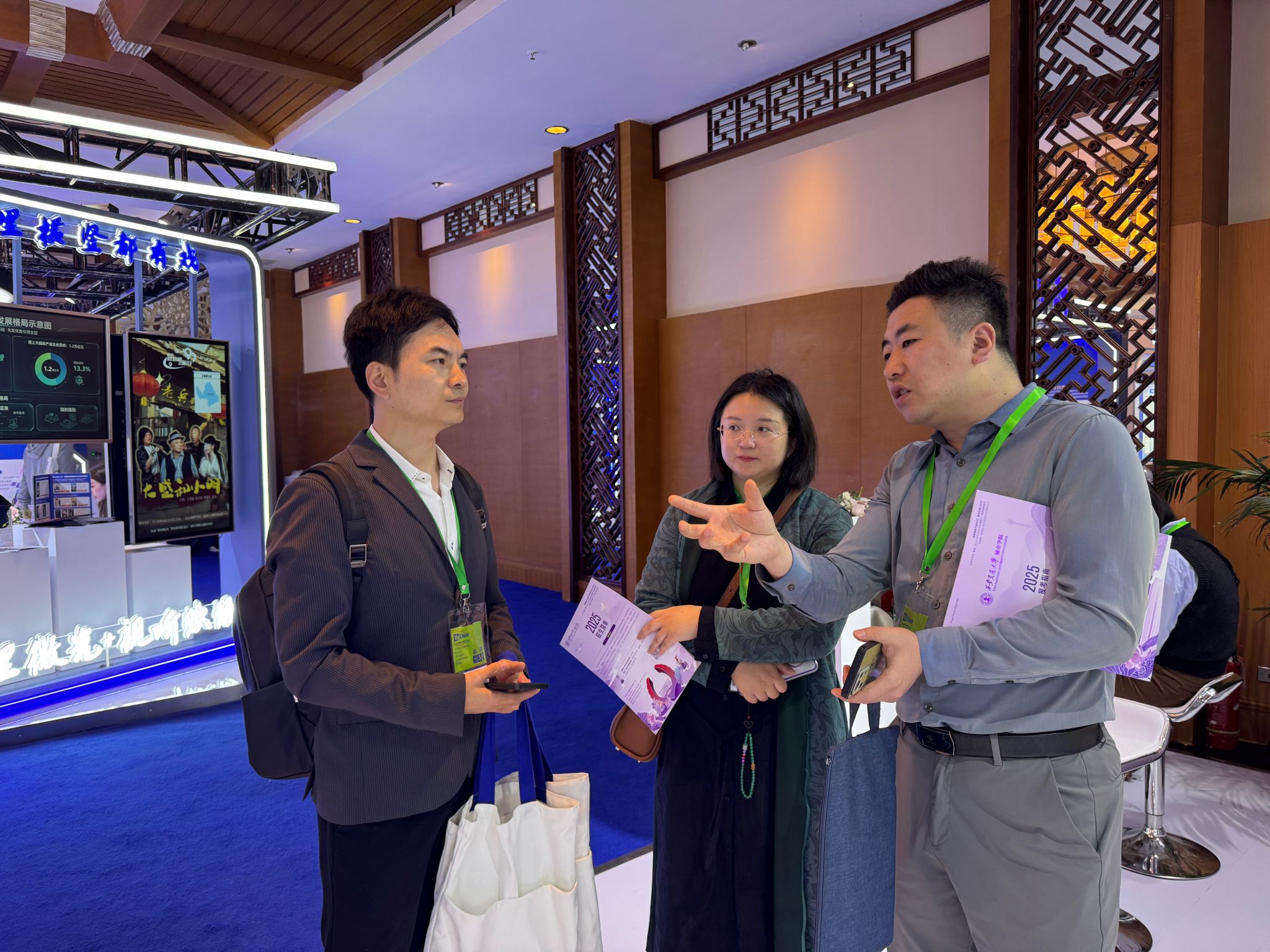 在为期两天的行程中,传媒与外国语学院一行深入主论坛及多场分论坛,重点了解AI赋能视听技术、文艺创新与全球传播实践、视听文旅融合、微短剧发展等行业最新动态,并全程参与了“2026网络视听创新展交流开放日”“天府融媒开放日”活动。在2026网络视听创新展现场,教师们参观了来自全国多个省份的最新技术与视听作品成果,从XR虚拟拍摄到AI内容生成系统,深刻感受到技术迭代对内容生产模式的颠覆性改变。教师们赴大会设置的校园招聘会进行调研并推介我校传媒专业,与多家参会企业及同行教师深入交流,详细了解了当前高校人才培养情况以及网络视听行业对复合型人才的具体需求,特别是“AI+内容生产”“短剧出海运营”等新兴岗位的能力要求,为学院人才培养方案修订积累了宝贵的行业依据。教师们前往分会场四川广播电视台开展调研,参与主流媒体发展论坛,实地探访西南首个多模态全流程XR数字影棚。在“天府融媒开放日”活动中,教师们与香港大公文汇集团等机构的一线新闻从业者展开交流,了解主流媒体全球化传播的创新探索。