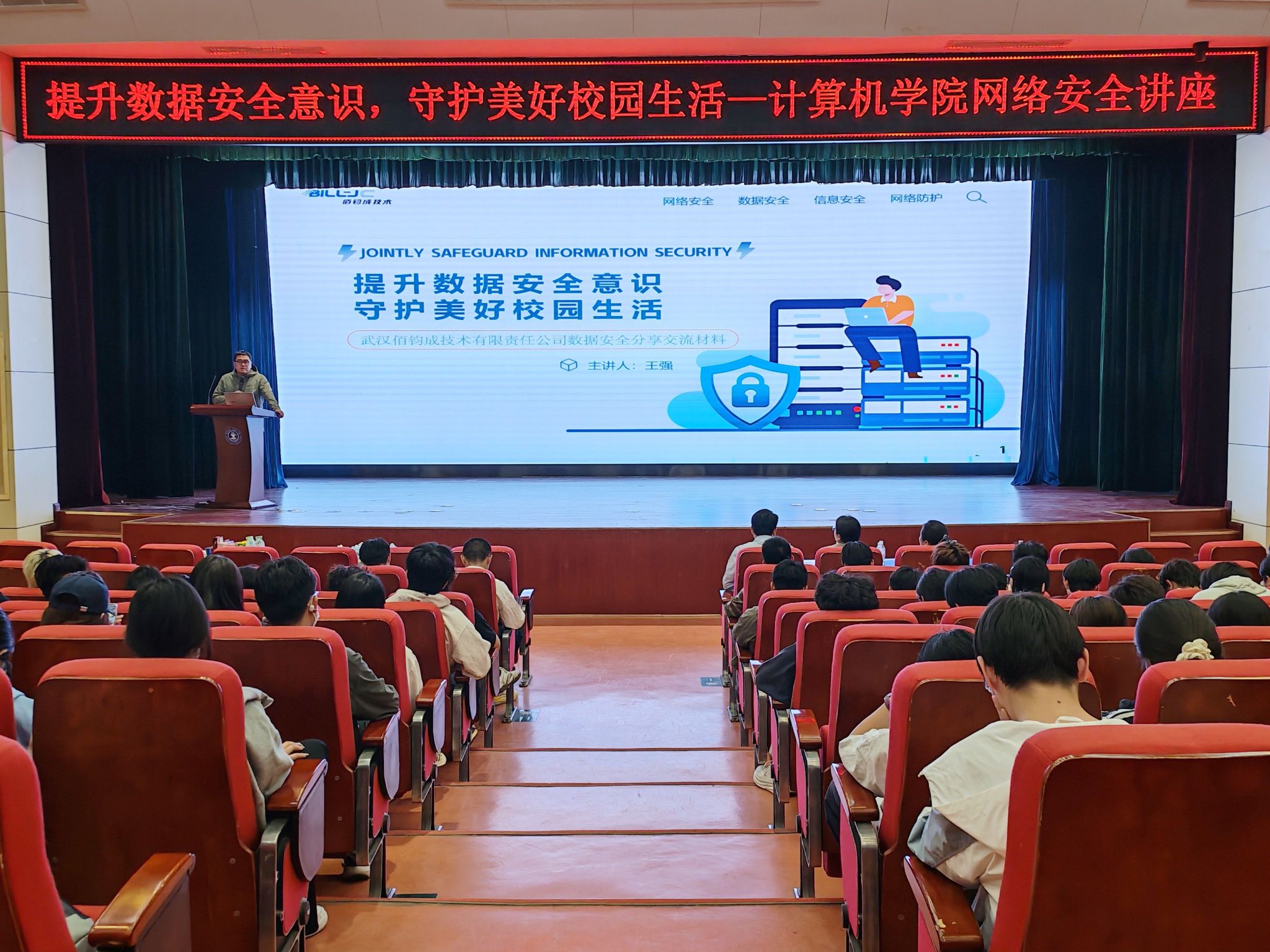 4月23日,武汉佰钧成技术有限责任公司信息安全管理负责人王强经理来校进行AI时代数据安全知识讲座。计算机学院党支部书记崔佳楠,2025级辅导员宁嘉浩参加讲座。