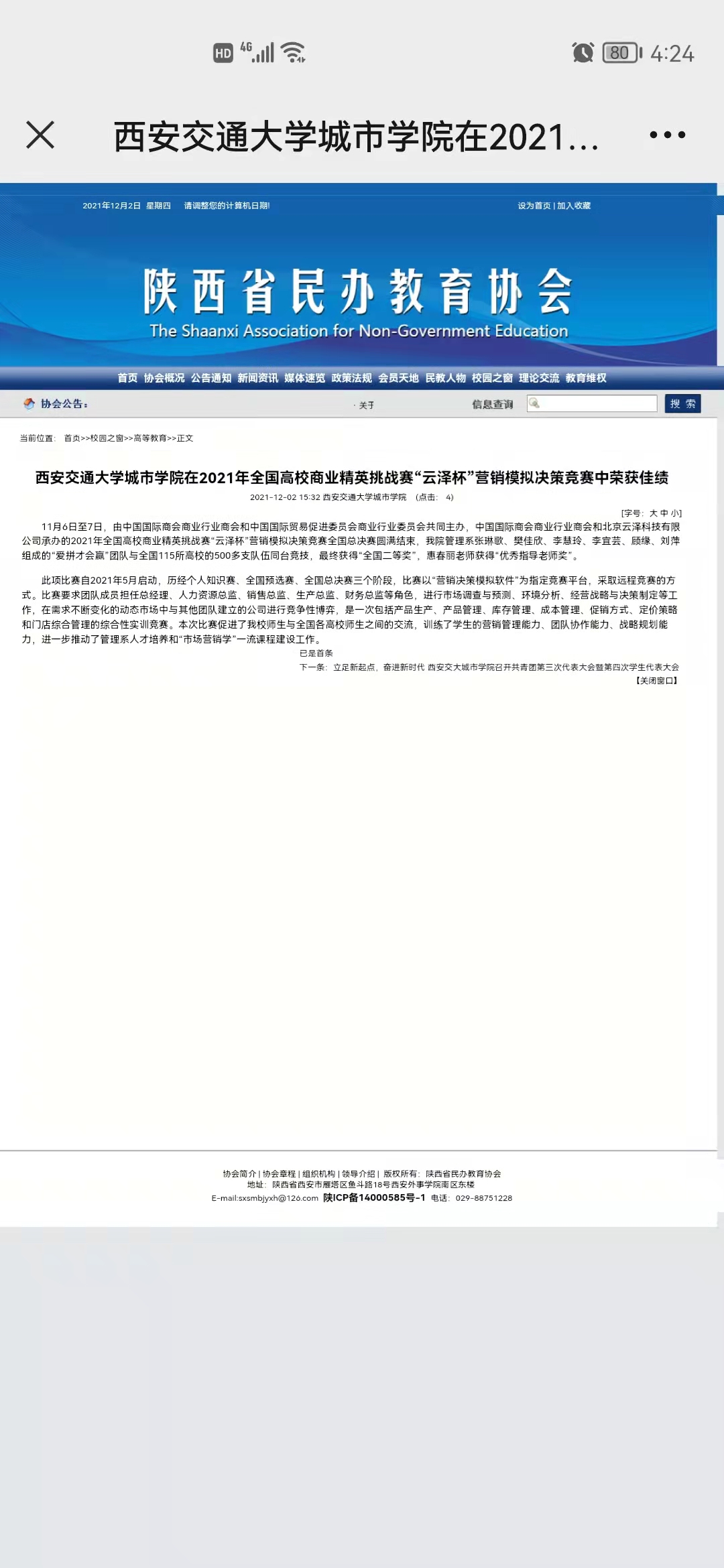 近日,陕西省民办教育协会报道了西安交通大学城市学院在2021年全国高校商业精英挑战赛“云泽杯”营销模拟决策竞赛中荣获佳绩情况,具体链接及内容如下: