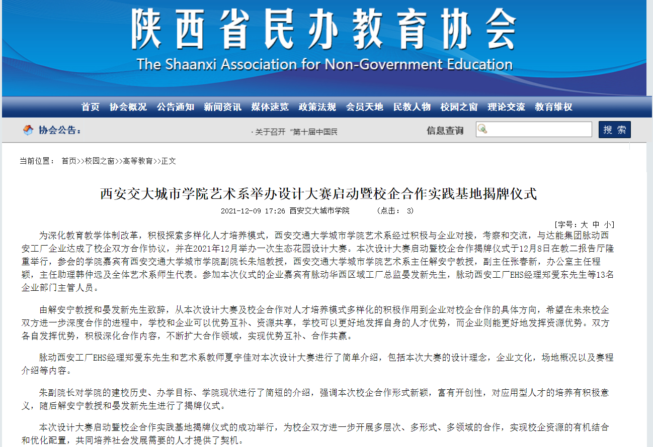 近日,陕西省民办教育协会报道了西安交大城市学院艺术系举办设计大赛启动暨校企合作实践基地揭牌仪式相关情况。具体链接及内容如下: