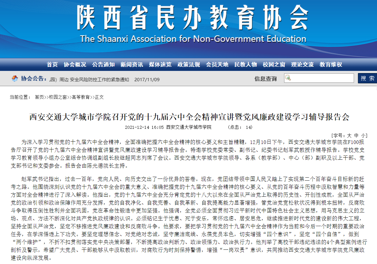 近日,陕西省民办教育协会报道了城市学院召开党的十九届六中全会精神宣讲暨党风廉政建设学习辅导报告会相关内容。具体链接如下:
