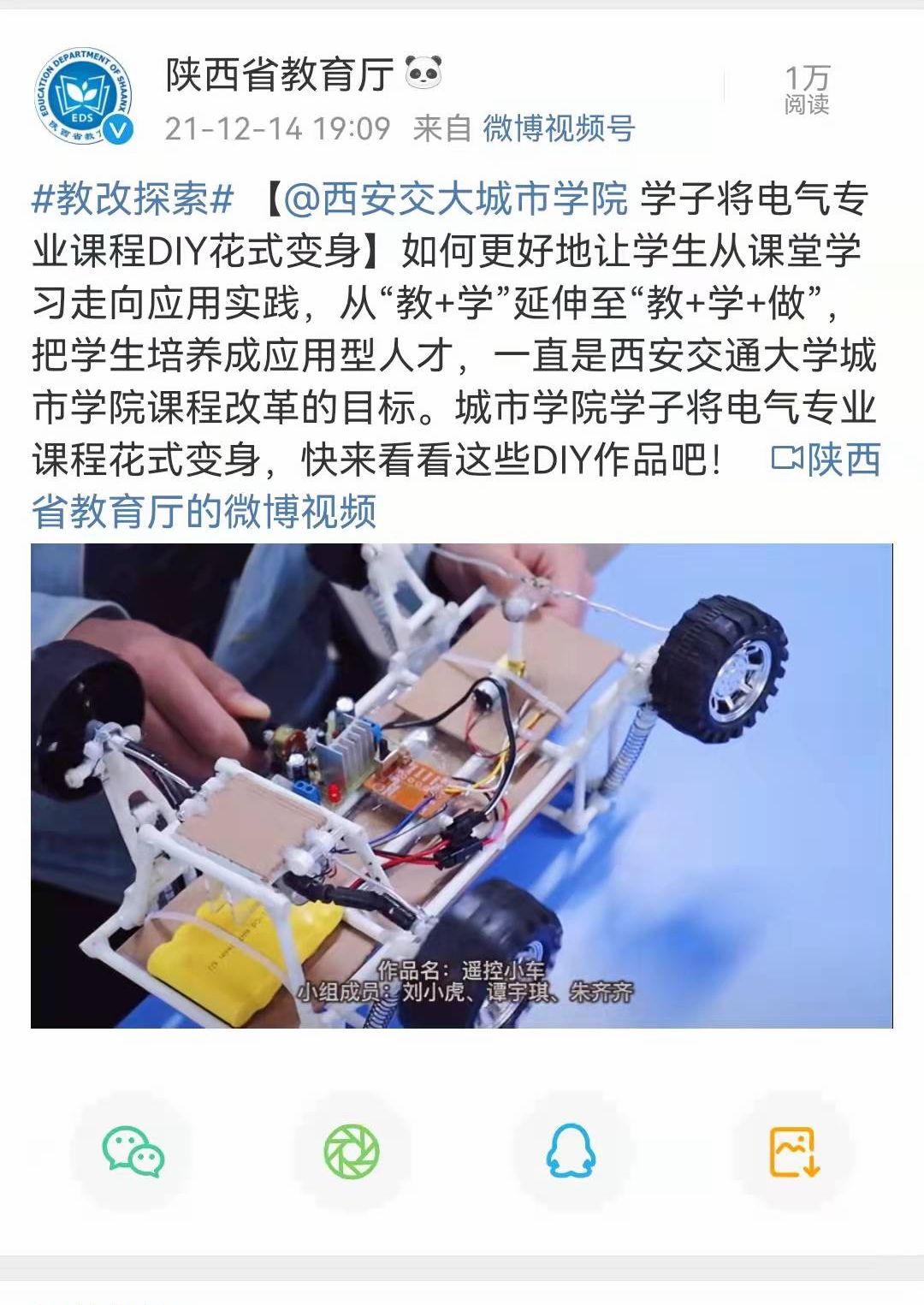 近日,陕西省教育厅官方微博报道了学院电气专业学子DIY作品内容。