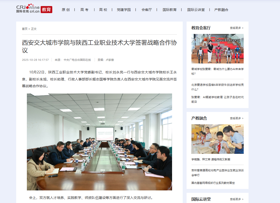 近日,中央广电总台国际在线对我校与陕西工业职业技术大学签署战略合作协议进行了报道。
