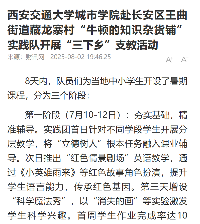 近日,中华网对我校学子暑期“三下乡”社会实践活动进行了报道。
