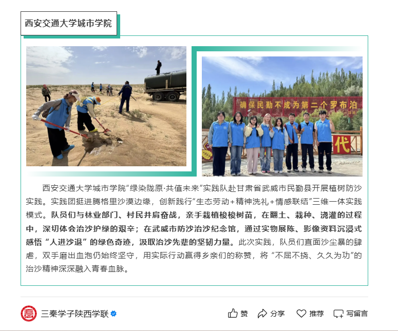 近日,三秦学子陕西学联对我校学子暑期“三下乡”社会实践活动进行了报道。