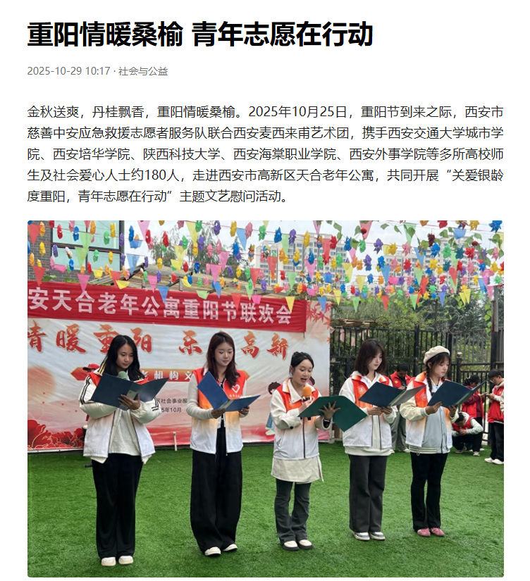 近日,社会与公益杂志社对我校志愿者重阳节志愿活动进行了报道。