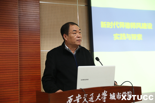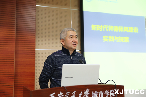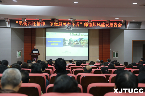 12月11日下午,西安交通大学城市学院在F100报告厅举行“弘扬西迁精神,争做最美奋斗者”师德师风建设报告会。西安交通大学博士生导师、教务处处长、创新创业学院院长、激光与粒子束科学技术研究所所长徐忠锋教授作了题为“新时代师德师风建设实践与探索”主题报告。学院中心组成员、主管以上干部、无教学任务的教学人员、辅导员代表及学生代表近180人到场聆听。学院党委书记冯民柱主持会议。