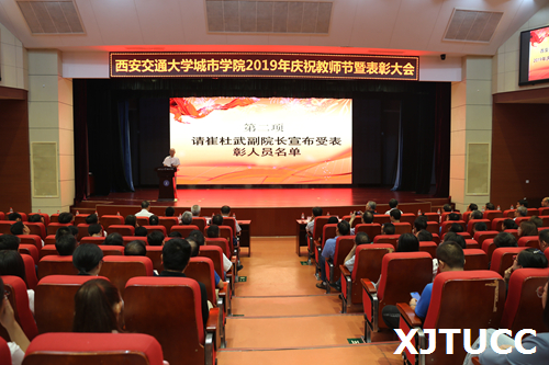 庆祝新中国七十华诞,弘扬新时代尊师风尚。9月10日下午,在我国第35个教师节来临之际,西安交通大学城市学院在教二报告厅召开2019年庆祝教师节暨表彰大会,表彰一年来在教学、科研、管理岗位做出突出贡献的优秀教职工。学院领导、各部门负责人、主管以上人员、教师代表和学生代表参加会议。冯民柱书记主持会议。