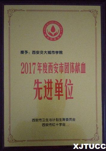 近日,西安交通大学城市学院获西安市卫生和计划生育委员会、西安市红十字会颁发的“2017年度西安市团体献血先进单位”荣誉称号。