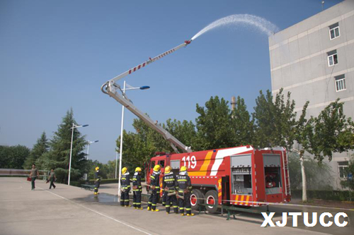 下午三点整,校园内烟雾弥漫,警报迭起,学员们迅速从宿舍楼内按照规定的逃生路线快速逃出,整个过程秩序井然。与此同时,消防员于火情周围拉上了警戒线,三辆“jp18举高喷射消防车”朝火灾处驶来,从不同角度喷射水柱开始灭火。巨大的水柱从管内喷涌而出,使得“险情”得以控制。最后,为了让学员们更进一步地了解消防演练目的和处理火情的具体流程,消防员将一系列消防工具进行展示,学员们逐一参观学习。本次消防演练由军训团和保卫部共同协作,旨在使同学们掌握了基本的火灾安全疏散常识和自救逃生方法。