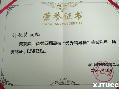 近日,陕西省委高教工委下发了《关于表彰陕西省第四届高校十佳辅导员、十佳辅导员提名奖和优秀辅导员的通报》(陕高教生〔2018〕8号),我院计算机系学生主管刘敏涛获陕西省高校“优秀辅导员”荣誉称号。