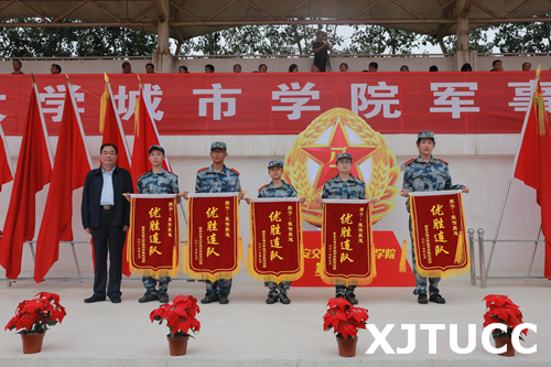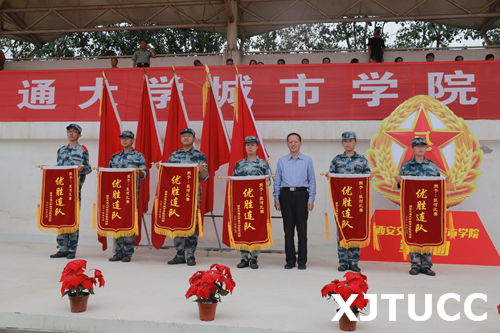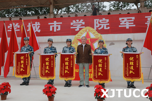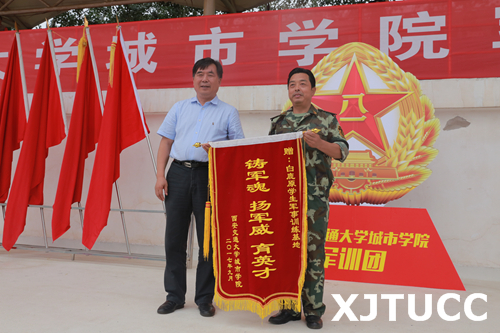 汇报表演结束后,冯民柱书记宣读了军训先进集体和优秀个人表彰决定,学院领导为获奖连队颁发了锦旗。陈光德院长向承训方赠送了锦旗。