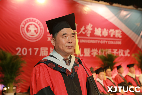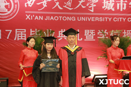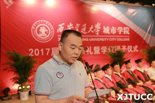 6月27日上午,西安交通大学城市学院2017届毕业典礼暨学位授予仪式在学生活动中心隆重举行。在主席台就座的嘉宾及领导有西安交通大学党委常委、副校长郑庆华教授,城市学院院长、博士生导师陈光德教授,副院长、博士生导师崔杜武教授,学院教授会主席王海民教授,学院学位评定委员会秘书、教学中心主任陈晓南教授,管理系主任卫民堂教授,经济系主任杨健全教授,电信系主任赵录怀教授,机械系主任刘吉轩教授,计算机系主任缪相林教授,外语系主任袁小陆教授,艺术系主任解安宁教授,传播系主任张蓉教授,土木建筑工程系主任郑爱平教授,护理系副主任王梅芳老师。在台下就座并出席今天大会的还有:学院党委冯民柱书记,张敬朝副院长,徐君陶院长助理,岳华海院长助理,学院各系(部)、中心(部)老师以及校友代表、学生家长等。大会由管理系王睿雪同学主持。