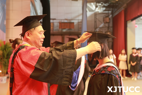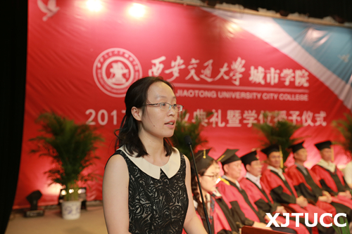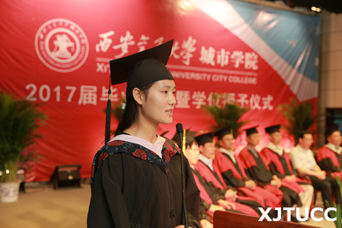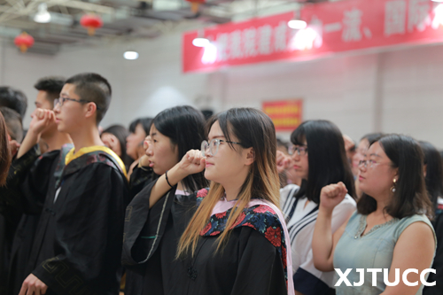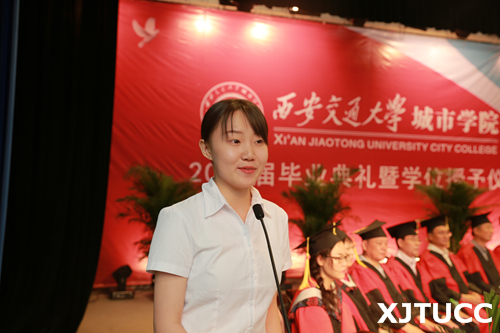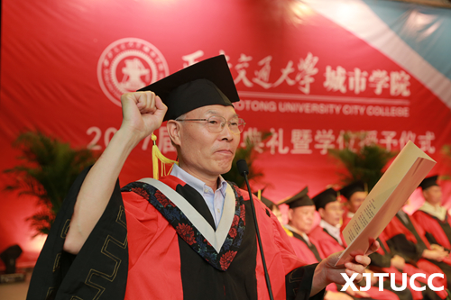 在王海民教授的带领下,全体毕业生集体进行宣誓:感恩父母养育,铭记师长教诲;弘扬城院精神,报效祖国人民。开拓创新,与时俱进,用青春和热血捍卫祖国,用激情和智慧建设祖国,为祖国的繁荣富强而努力奋斗,让明日的西安交通大学城市学院以我为荣。大家声音洪亮,场面庄严而隆重。