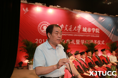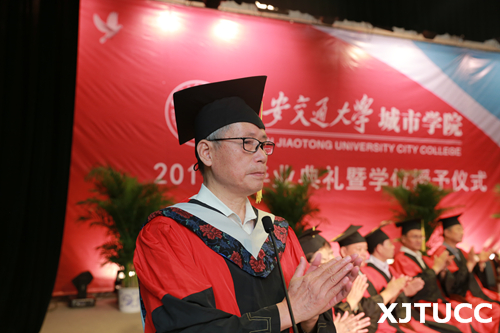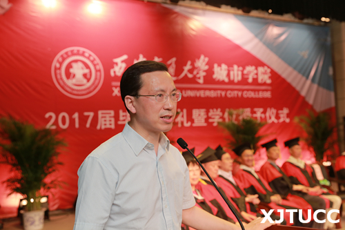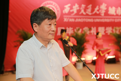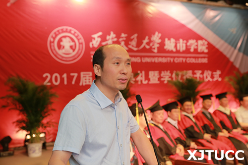 西安交通大学党委常委、副校长郑庆华教授向毕业生寄语。他首先对所有顺利毕业的同学表示祝贺,并对因为种种原因暂时没有取得学位和就业的同学予以鼓励。郑校长指出,责任是能力和品质,希望同学们担负起国家、社会和家庭的责任,牢记西安交通大学城市学院的精神和使命,牢记家长和老师的教诲,努力拼搏,绽放出自己更加精彩的人生!