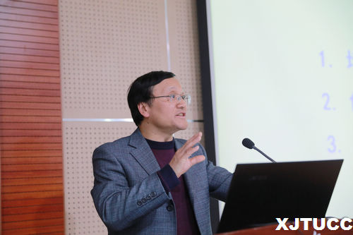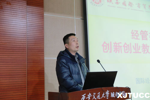 会议首先由西安交通大学城市学院崔杜武副院长致辞,他欢迎各位嘉宾、老师和同学参加本次活动,强调创新创业在我国经济转型期显得尤为重要,也表示学生在实践中创新能力不断提高,将来走向社会才会对经济发展产生积极作用。