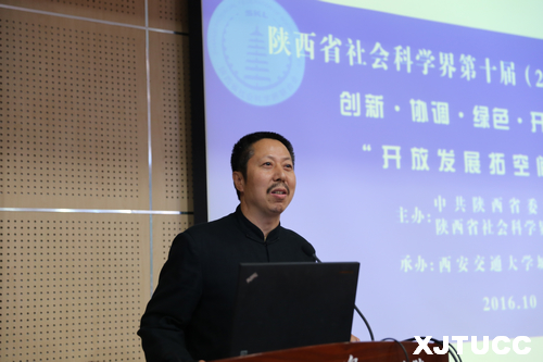 陕西省社科联党组成员、副主席朱晓悦发言。他指出,为了深入贯彻学习习近平同志系列重要讲话精神,认真贯彻落实十八届三中、四中、五中全会精神,推动社会科学理论的创新,展示我省社科界在陕西经济社会发展中的积极作用,本届学术年会的主题确定为“创新·协调·绿色·开放·共享”。他希望在座的专家学者在活动中能够畅所欲言,结合实际,结合省情,对陕西的经济改革发展进行深入思考,探讨符合实际、切实可行、操作性强的策略、方法,以推动我省经济建设健康持续发展。
