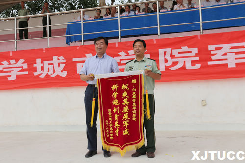 阅兵式结束后,学院党委书记冯民柱宣读了军训先进集体和优秀个人表彰决定,学院领导为获奖连队颁发了锦旗。陈光德院长向白鹿原学生军训基地赠送了锦旗。