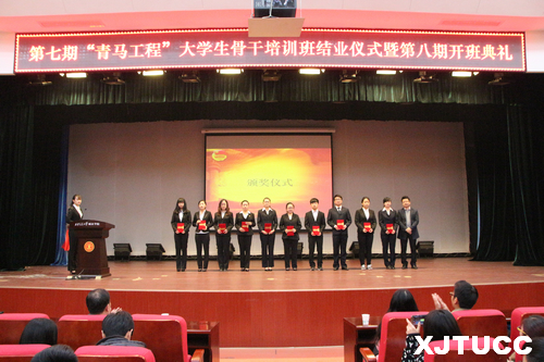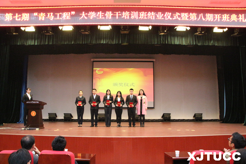 伴随着激昂的中国共产主义青年团团歌,大会正式拉开帷幕。主持人常钰婷介绍了前七期“青马工程”大学生骨干培训班的实施情况以及取得的良好成果。学院团委韩树老师宣读了关于授予第七期学员“标兵学员”“优秀答辩奖”“优秀组织奖”荣誉称号的表彰决定,之后,曹嘉伟老师、韩树老师分别为获得“优秀答辩奖”、“优秀组织奖”、“标兵学员”的学员代表颁奖。