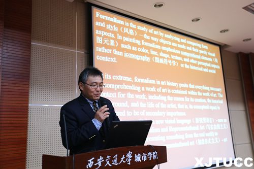 之后,蒋临夏教授在F100为艺术系和人文社科系的学生做了“自然主义vs形式主义:从毕加索到尤恩.厄格罗的艺术共享之路”讲座。讲座集中研究了自然主义和现实主义在西方艺术史上的历史演变。精彩的讲座博得现场同学的热烈掌声。蒋临夏是纽约州立大学布法罗分校美术系艺术学教授,同时受过多国教育的他,其作品具有国际性和时代性,大量作品被用于私人收藏和公共展览。许洪良教授为现场学生介绍了布法罗学院基本情况,并就学生感兴趣的问题进行了解答。