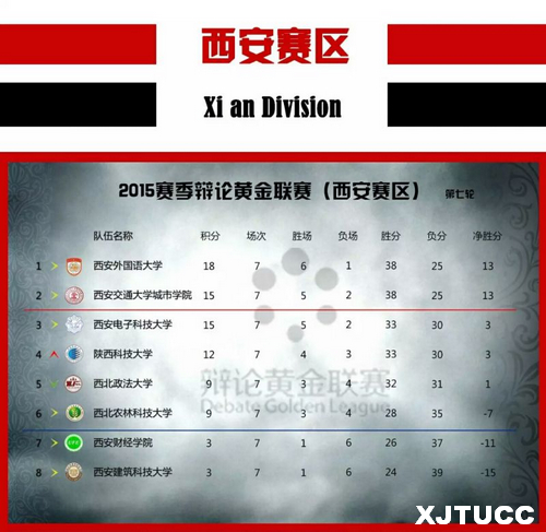 12月12日,历时近半年的2015赛季辩论黄金联赛西安赛区比赛在西安电子科技大学落下帷幕。经过7轮比赛的激烈角逐,西安交通大学城市学院辩论队以5胜2负的战绩荣获西安赛区亚军,获得2015年辩论黄金联赛冠军杯(全国赛)的参赛资格。