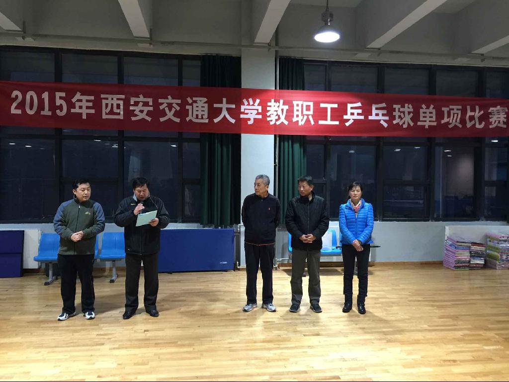 2015年西安交通大学教职工乒乓球赛于11月20日至21日在西安交通大学大学生文体教育中心举行。本次活动由西安交通大学工会组织,旨在落实《西安交通大学促进教职工身心健康二十条》,活跃教职工业余文化生活,进一步开展全民健身运动,促进校园文化建设,提高教职工乒乓球运动水平。全校共有24个单位450余人参加,设有男子单打、女子单打、男子双打、女子双打和混合双打5个项目。