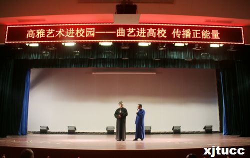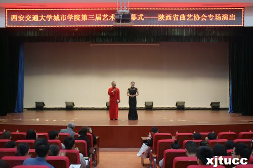 2015年4月13日19:00,西安交通大学城市学院第三届艺术节开幕式暨高雅艺术进校园——陕西省曲艺家协会专场演出在教二报告厅顺利举办。陕西省曲协副主席于海涛、陕西省曲艺家协会办公室主任郭长春、深圳曲协副主席任士和、陕西快书艺术委员会副主席阎卫国、陕西省快板书、山东快板书艺术委员会副主席杨锦龙、我院副院长崔杜武教授、院团委曹嘉伟书记、蔡融融老师以及各系团工委书记等出席此次演出。本次演出由陕西广播电视台戏曲频道主持人海龙以及本校学生曹梦泉主持。
