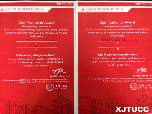 4月10日至13日,西安交大城市学院英文模拟联合国代表一行四人在外语系胡婷老师的带领下,参加了在西安交通大学举办的第六届模拟联合国大会。李喆和刘丰铭同学代表的印度尼西亚、刘伟和党皓舟同学代表的南非在会上主动积极开展国家外交,运筹帷幄,极大推动了会议的进程,获得了"最具潜力组织者"奖。学院两位代表印尼的学生会前对本次会议的议题做了深入细致的调研工作,语言和学术水平受到大会主席团的一致认可,最终荣获了"杰出代表"的奖项。