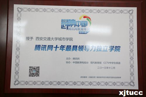2013年12月5日,“回响中国”2013腾讯网教育年度总评榜荣耀盛典在北京香格里拉大酒店隆重举行,西安交通大学城市学院凭借先进的办学理念和优异的办学成果,荣获本次教育总评榜“十年最具领导力独立学院”称号。