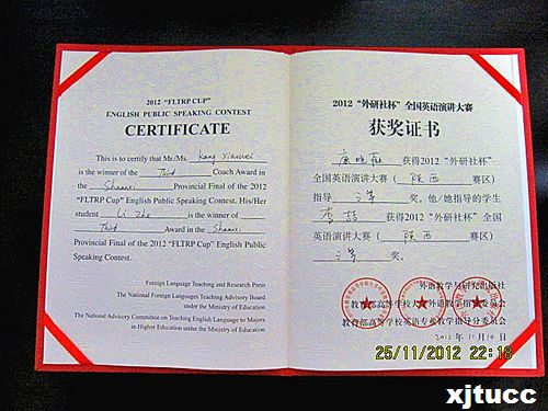 西安交大城市学院教改电201班的李喆同学在2012年“外研社杯”全国英语演讲大赛陕西区域复赛中荣获三等奖。康晓薇老师获得“指导老师三等奖”。 该项赛事是由外语教学与研究出版社主办,教育部高等学校大学外语教学指导委员会与教育部高等学校英语专业教学指导委员会合办。陕西省区域复赛于2012年11月9-10日在空军工程大学长乐坡校区举办,参赛选手经历了一个多月层层选拔,最终脱引而出,最终代表我院在在陕西区域赛中获得了优异的成绩。