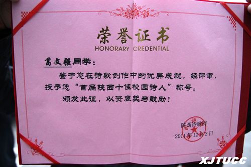 组委会邀请了西安交通大学中文系博士生导师李明德教授、长安大学文学与艺术传播学院院长黄建国教授、著名诗人成路、尚飞鹏、三色堇等老师作为评委,对所有来稿进行了严格评选,我院艺术设计系书法101班葛文强同学以总分第一名的优异成绩荣获“陕西十佳校园诗人”称号。颁奖仪式上评委会的授奖辞这样写道:“在纷繁的意象里,讲究分寸地把控放纵的情感,葛文强的诗歌创作,显然超出同龄人一般的泛滥式抒情,与闭门造车式的凭空捏造。他忧而不伤,更不腻味。他有梦想,但不沉迷。而始终保持着创作时的警惕性与敏感度,通过细致刻画,精心雕琢,让我们在情不自禁中,与他一道享受诗歌。”