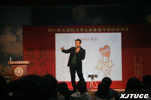 演讲开始前,由院党委书记赵金胜老师为FM101.1《张持有道》栏目主播张持老师颁发西安交通大学城市学院学生职业导师聘书。然后,张持老师展开其激昂而富有特色的演讲——《找份工作去恋爱》。首先,他通过自身的经验向同学们详细阐述了爱情与事业的关系,“前者是后者的精神支柱,后者是前者的物质基础”,并希望大家处理好二者关系。其次,他将恋爱过程与找工作二者进行类比,极尽巧妙地介绍如何找到一份稳定合适的工作。他告诫在场的同学,戒除好高骛远、眼高手低等缺点,用自己的专业知识特长定位自身将从事的行业,用自己的能力特长定位自身将从事的岗位。并通过介绍“老乡翁”孙国秀、哈牙豆业等具体实例,希望即将毕业的同学们在找工作的过程中专注于一份工作,做好自己能做的事情,然后挑战自己想做的事情。与此同时,张持老师通过个性的幻灯片表现传授给在场同学书写简历和面试的技巧,并希望广大同学树立“先就业,再择业”的就业观念,使在场同学受益匪浅。