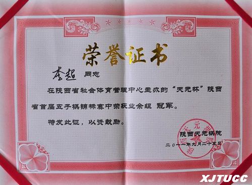 近日,由省体育局社会体育管理中心、省围棋协会主办的2011年“天元杯”陕西省首届五子棋锦标赛在西安市第八十三中学举行。比赛分组专业组和业余组两个组别,共有来自全省各地区、俱乐部、高校社团近百名五子棋爱好者参赛。我院“无棋不友”棋社成员李超同学代表学院进行业余组的竞赛,最终在选手中脱颖而出,以全胜的战绩获得比赛冠军。