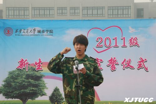 紧接着,新生代表机械系王柏森同学带领全体2011级同学进行庄严的成人宣誓。面对鲜艳的五星红旗,新生同学们满怀激情,铿锵有力地呐喊出成人誓词,以孝心对父母,以热心对社会,以忠心对国家,立志成为有理想、有道德、有文化、有纪律的社会主义公民。