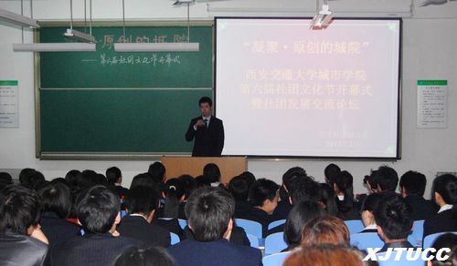 在开幕式暨社团发展交流论坛上,校内外各社联、学生社团代表就社团的发展积极展开研讨。我院社团联合会薛梅同学基于城市学院学生社团发展的现状,分析了学院目前社团工作中存在的四点问题,提出了我院社团可持续发展的对策和建议。支农促进会的魏梦莎菲同学、弈术辩论协会的李相欣同学分别就各自社团的定位、社员的交流、社团文化等进行探讨。交大社团联合会叶树波同学从引导社团文化建设、服务和管理社团、开发社联精品活动三个方面阐述了新形势下交大社联发展的新思路。全国“百强社团”交大沈杨书社的俞君豪同学以沈杨书社2011年校园读书节为切入点,分享了社团干部培养、社团文化传承等方面的心得体会;西安建筑科技大学东校区的张辰斌同学也结合校区的特点介绍了本校社团发展中一些特色活动。论坛上,我院社团同各高校社团之间积极交流,相互学习,共同切磋,从中对社团的长远发展获得了良好的启发。