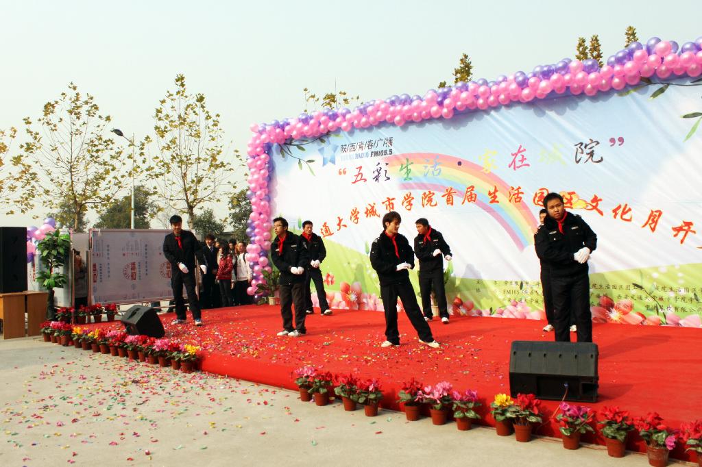 11月25日中午,旭日高照,彩球纷飞,在西安交大城市学院老食堂门口,由学生服务中心后勤办公室、生活园区团工委、学委会联合主办的“五彩生活,家在城院”首届生活园区文化月活动隆重启幕。学院院长陈光德教授,党委书记赵金胜副教授,学生服务中心主任马兆平老师,条件建设与保障部主任李西明老师,以及学院部分系室的老师、生活园区各服务单位出席了活动。