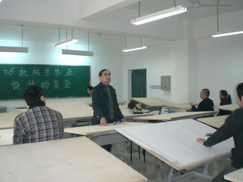 3月2日上午10点半,机械系在实验楼218室举办了06级毕业生毕业设计动员大会。机械系主任诸文俊教授、副主任林家让教授、王毅教授、杨振坤教授以及其他指导教师、辅导员参加了此次会议。本次大会由诸文俊教授及林家让教授主持。