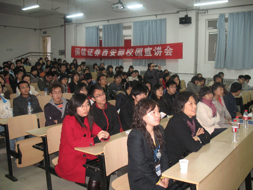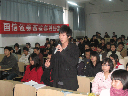 国信证券作为国内十大券商之一,十分重视人才的选聘和培养,此次宣讲就是带着他们的“雏鹰计划”而来,即集人才选拔、招聘、培训及持续培养为一体的系统工程。整个计划分为两个层面,一是在校期间的培养,奖励与选拔,二是进入公司的集中培训与岗位见习。会上郑婷女士针对大家比较关心的面试环节、工作环境及工作内容等进行了精彩解答。随同的另外两位国信员工是我院05级金融专业毕业生,他们利用自己的工作经历为同学们提供了很多有用的意见和建议,鼓励大家在校期间应好好学习,培养良好的学习习惯。