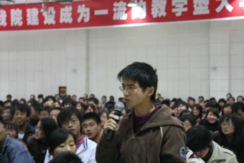 崔建军教授从当前金融危机的现象入手,运用经济学的思维方式进行了细致入微的分析和推理,对金融危机的由来,全球经济和我国经济的负面影响和对我们的启迪,并结合当前我国经济面临的新形势,提出了相应的对策建议。崔教授语言风趣幽默,见解独到深刻,尤其是将复杂的经济学道理深入浅出地表达出来,他的“大危机大机遇观、经济学者务实观、经典著作精读观、发现美与发现丑的能力观”等观点与在场师生产生共鸣,会场多次爆发出雷鸣般的掌声。在随后的现场提问环节中,我院学生思维活跃,争相发问,崔建军教授对其进行一一解答。